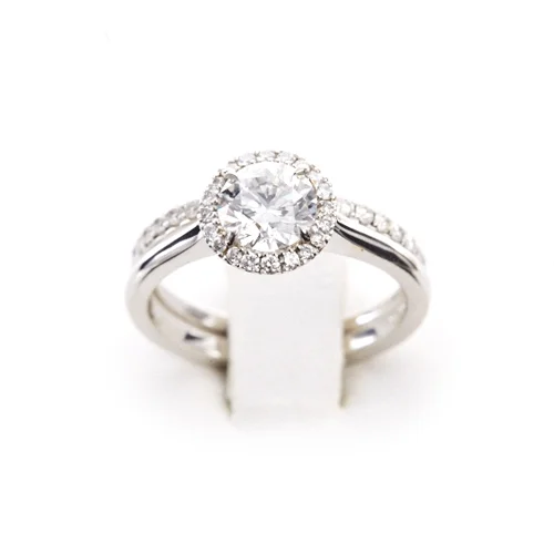 The halo setting is diamonds or other gemstones set in a concentric circle or square around a central stone. This setting makes the central stone appear larger and increases the overall sparkle of the ring. A great option to boost the appearance of a small central diamond.